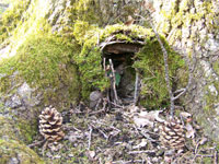 Die Kinder können nun zwischen den Wurzeln größerer Bäume aus Moos, Hölzchen, Rindenstücken und sonstigen Naturmaterialien Häuschen, Ställe und ganze Dörfer bauen.