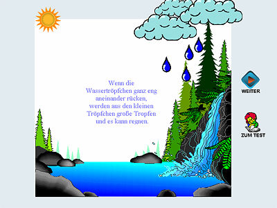 Wenn die Sonne scheint, verdunstet viel Wasser der Meere und auch der Seen. Das verdunstete Wasser steigt hoch und sammelt sich als Wasserdampf in Wolken, hoch am Himmel.